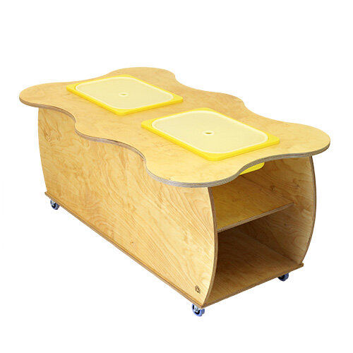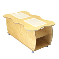 Hierfür sind in der Tischplatte zwei Forscherboxen mit Deckel eingelassen, die sich mit den unterschiedlichsten Materialien befüllen lassen. Zusätzlichen Stauraum bieten 2 Böden unterhalb der Tischplatte. Der robuste Tisch ist mit 4 Lenkrollen ausgestattet, davon sind 2 Rollen feststellbar.